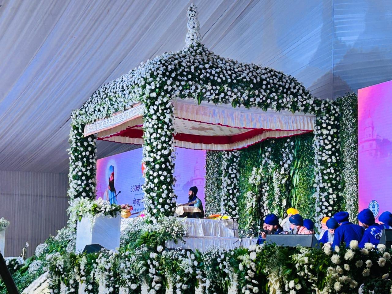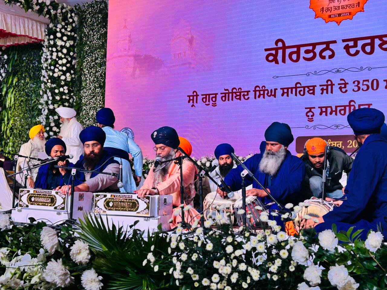 ਸ੍ਰੀ ਅਨੰਦਪੁਰ ਸਾਹਿਬ, 23 ਨਵੰਬਰ : ਸ੍ਰੀ ਗੁਰੂ ਤੇਗ ਬਹਾਦਰ ਜੀ, ਭਾਈ ਮਤੀ ਦਾਸ ਜੀ, ਭਾਈ ਸਤੀ ਦਾਸ ਜੀ ਅਤੇ ਭਾਈ ਦਿਆਲਾ ਜੀ ਦੇ 350ਵੇਂ ਸ਼ਹੀਦੀ ਦਿਹਾੜੇ ਨੂੰ ਸਮਰਪਿਤ ਸ੍ਰੀ ਅਨੰਦਪੁਰ ਸਾਹਿਬ ਵਿਖੇ ਪੰਜਾਬ ਸਰਕਾਰ ਵੱਲੋਂ ਕਰਵਾਏ ਜਾ ਰਹੇ ਸਮਾਗਮਾਂ ਦੀ ਲੜੀ ਤਹਿਤ ਅੱਜ ਬਾਬਾ ਬੁੱਢਾ ਦਲ ਛਾਉਣੀ ਦੇ ਮੁੱਖ ਪੰਡਾਲ਼ ਵਿਚ ਸ੍ਰੀ ਗੁਰੂ ਗ੍ਰੰਥ ਸਾਹਿਬ ਜੀ ਦੀ ਹਜ਼ੂਰੀ ਵਿਚ ਸਜੇ ਸ਼ਾਮ ਦੇ ਦੀਵਾਨਾਂ ਵਿਚ ਪੰਥ ਦੇ ਪ੍ਰਸਿੱਧ ਕਥਾ ਤੇ ਕੀਰਤਨੀ ਜਥਿਆਂ ਵੱਲੋਂ ਸੰਗਤਾਂ ਨੂੰ ਗੁਰੂ ਚਰਨਾਂ ਨਾਲ ਜੋੜਿਆ ਗਿਆ।